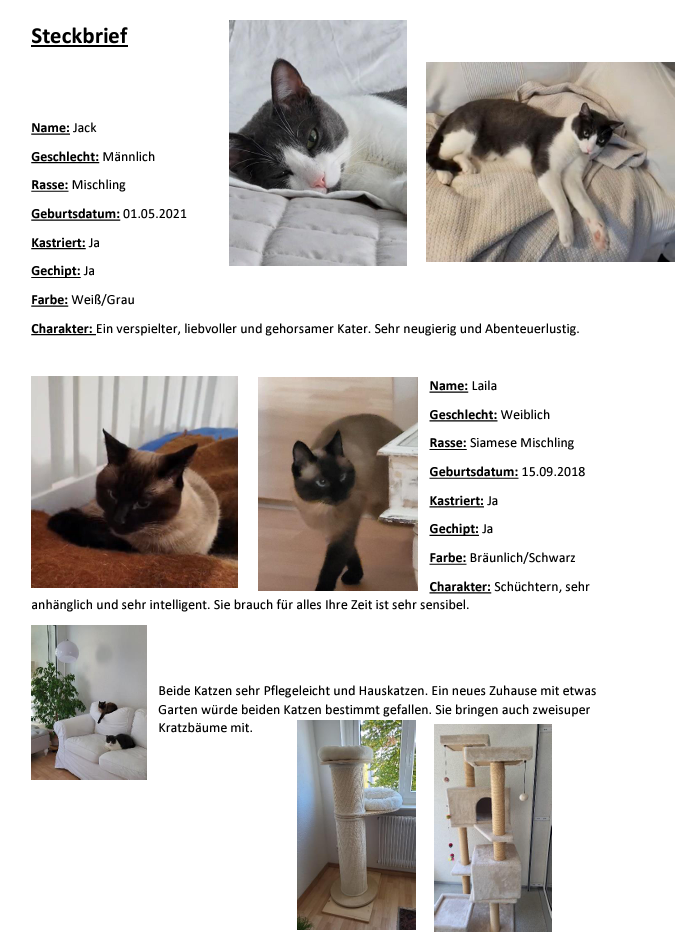 Auf dieser Seite sind Tiere, die von Privatpersonen vermittelt werden. Das Tierschutzheim Konstanz übernimmt keine Verantwortung für die Richtigkeit der Angaben. Für Fragen wenden sich bitte an die in den Berichten angegebenen Telefonnummern und Adressen.