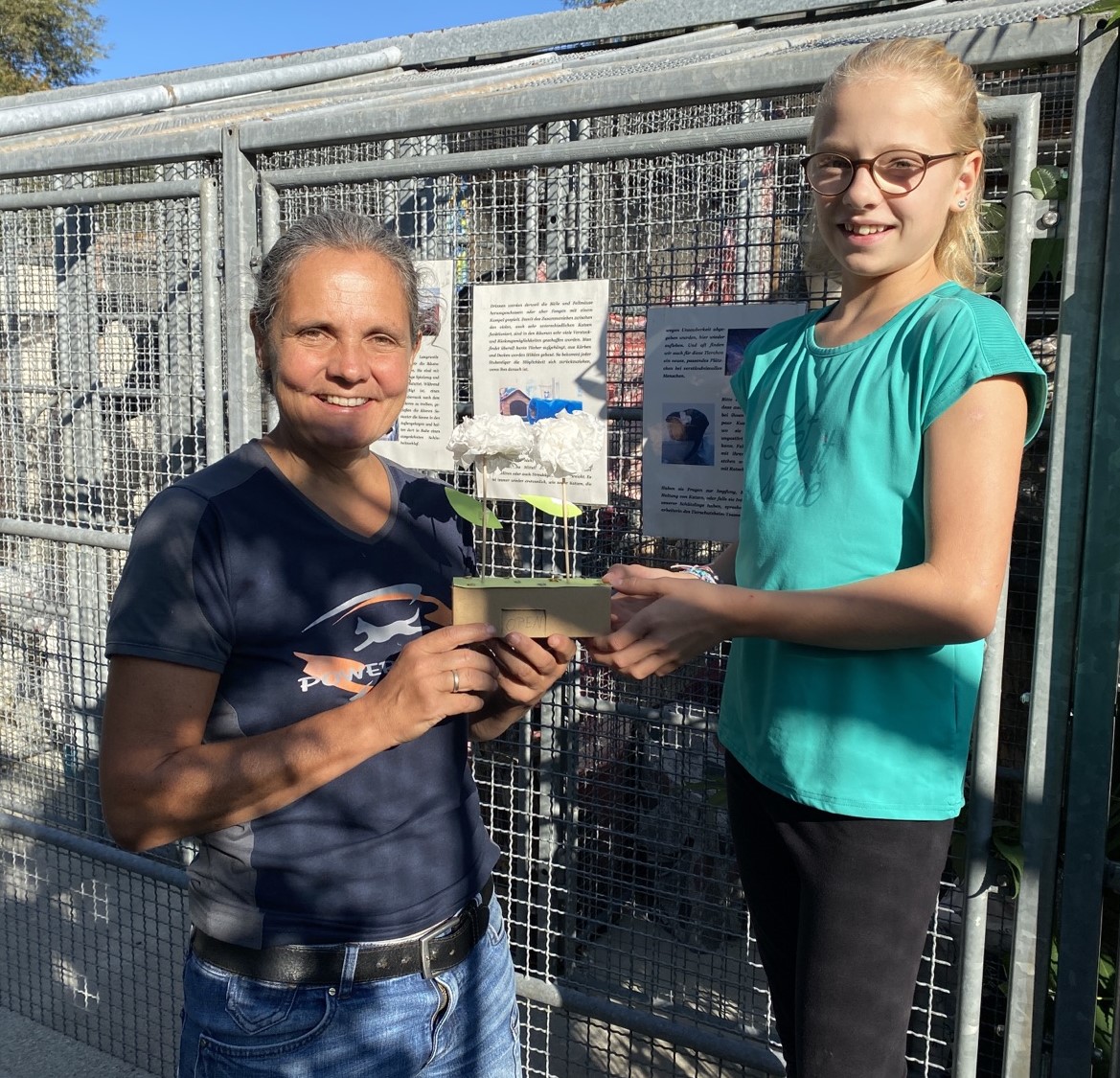 Flohmarkterlös für Tiere Beim großen Konstanzer Flohmarkt verkauften Frieda Benkendorff und Lina Maas etliche Gegenstände, die sie nicht mehr brauchten. Das macht Platz im Kinderzimmer und bringt eine Flut in den Geldbeutel. Und davon profitierten auch die Tiere des Tierschutzheims: Die Hälfte des Verkaufserlöses (95 €) haben die beiden Schülerinnen gespendet. Zusätzlich bekamen die Vierbeiner bei der Geldübergabe noch einen Extra-Präsentkorb. Die Tierheimbewohner sagen ganz herzlichen Dank und der nächste Flomarkt kommt bestimmt.... |