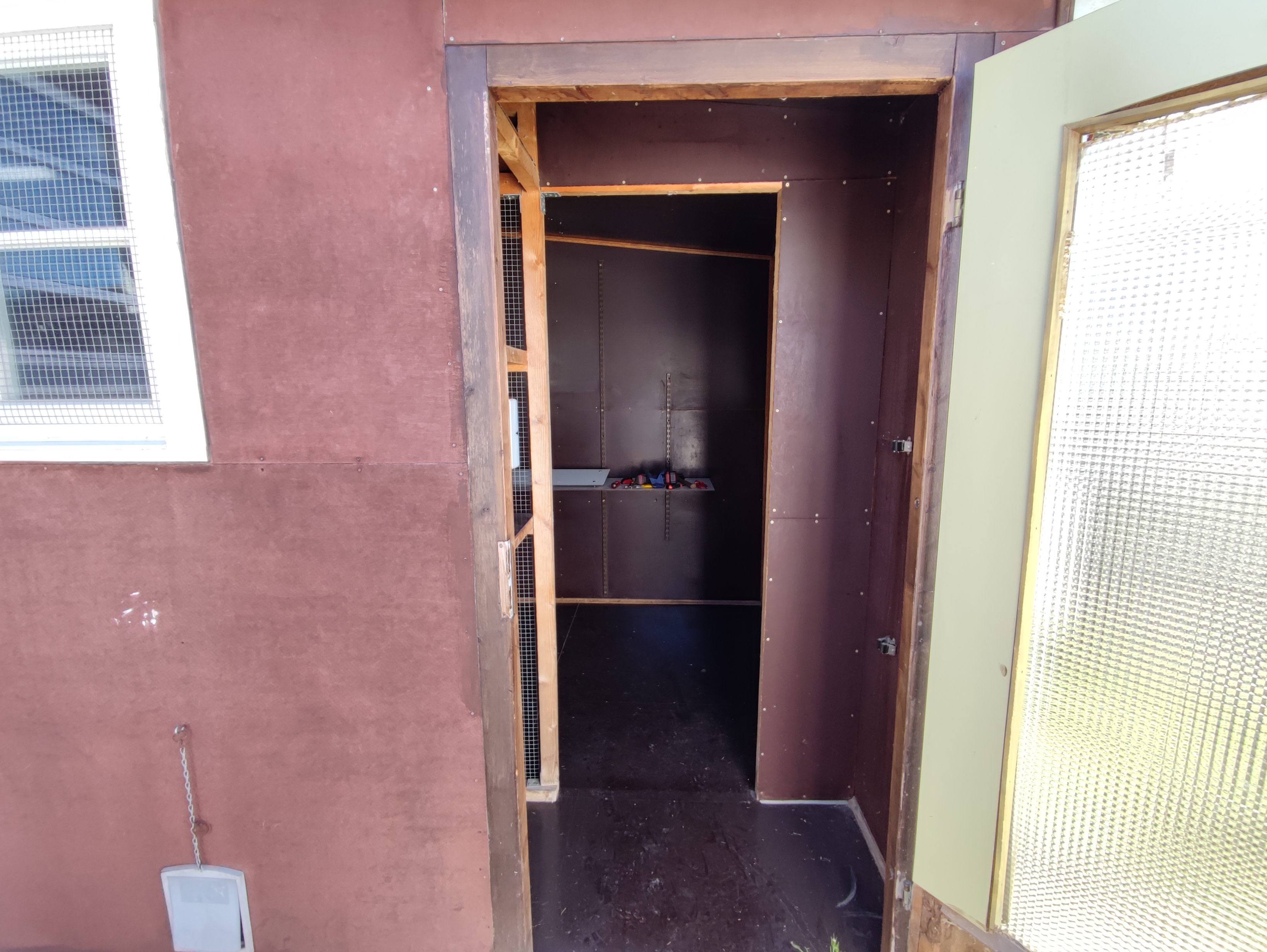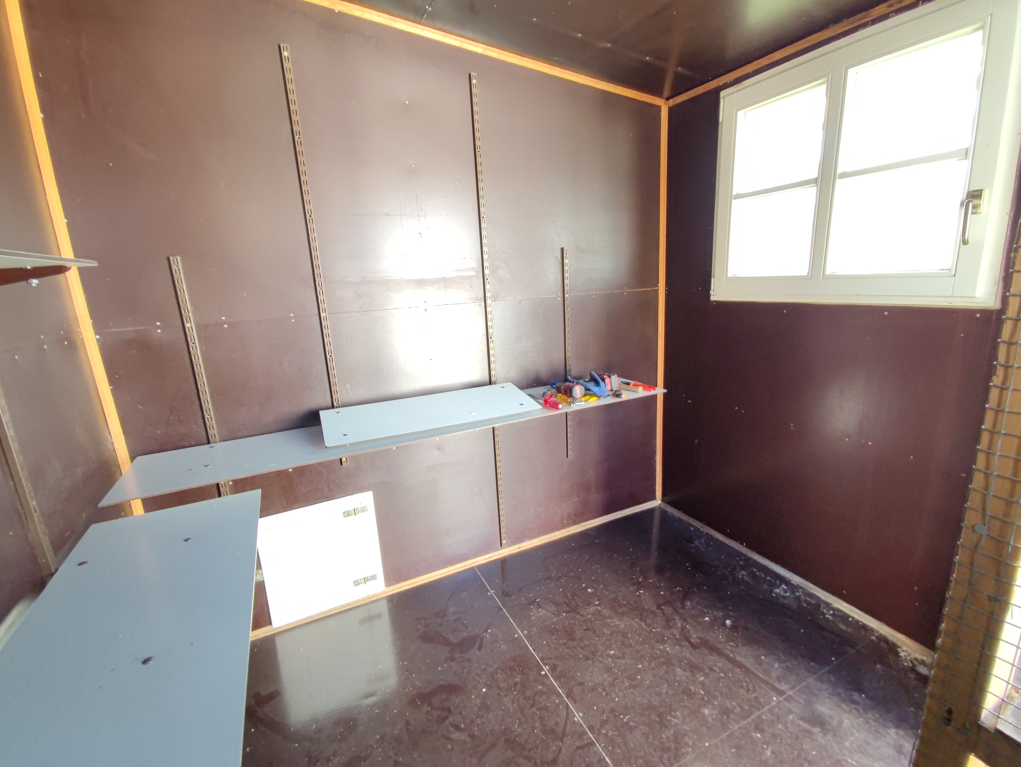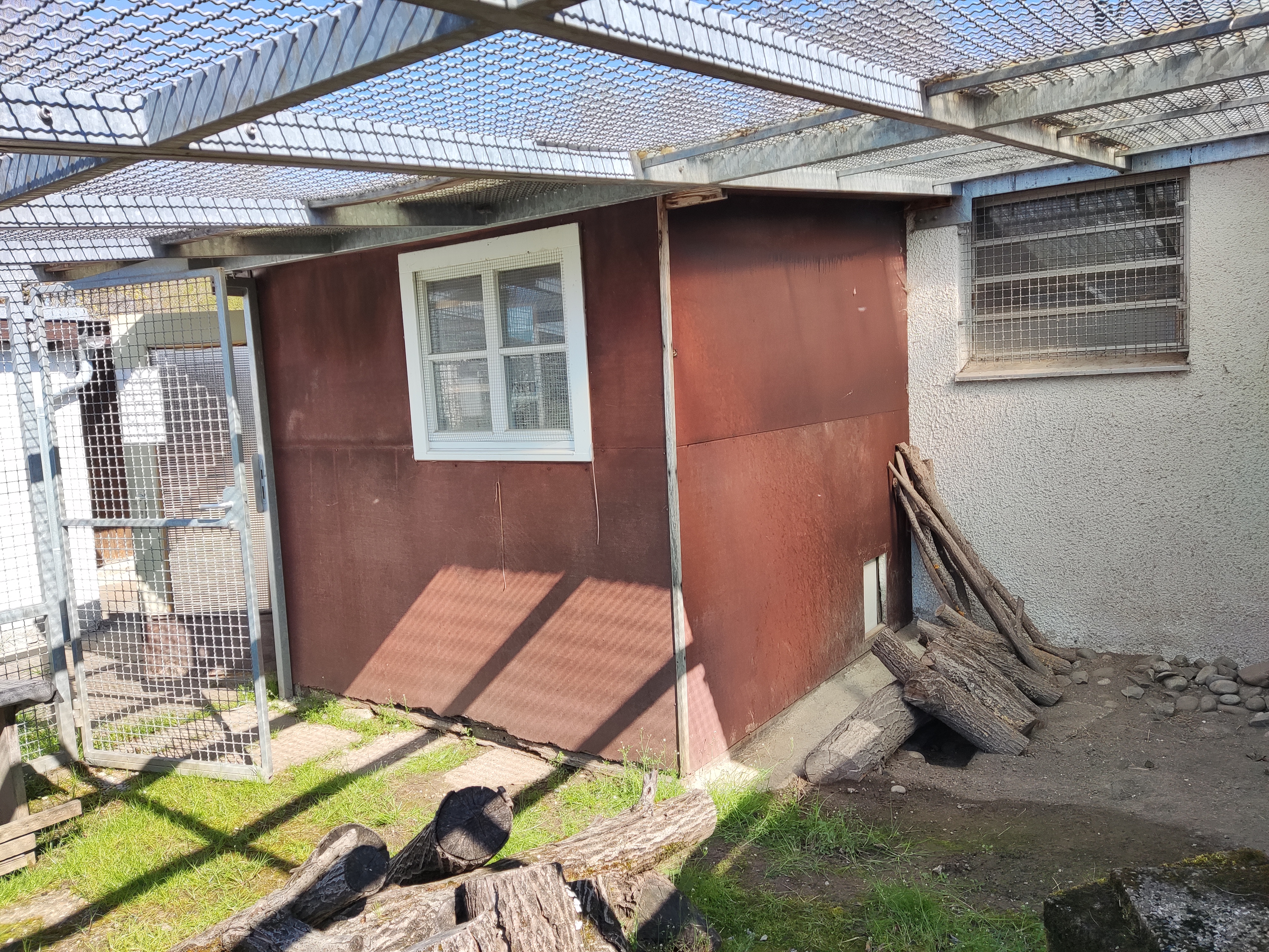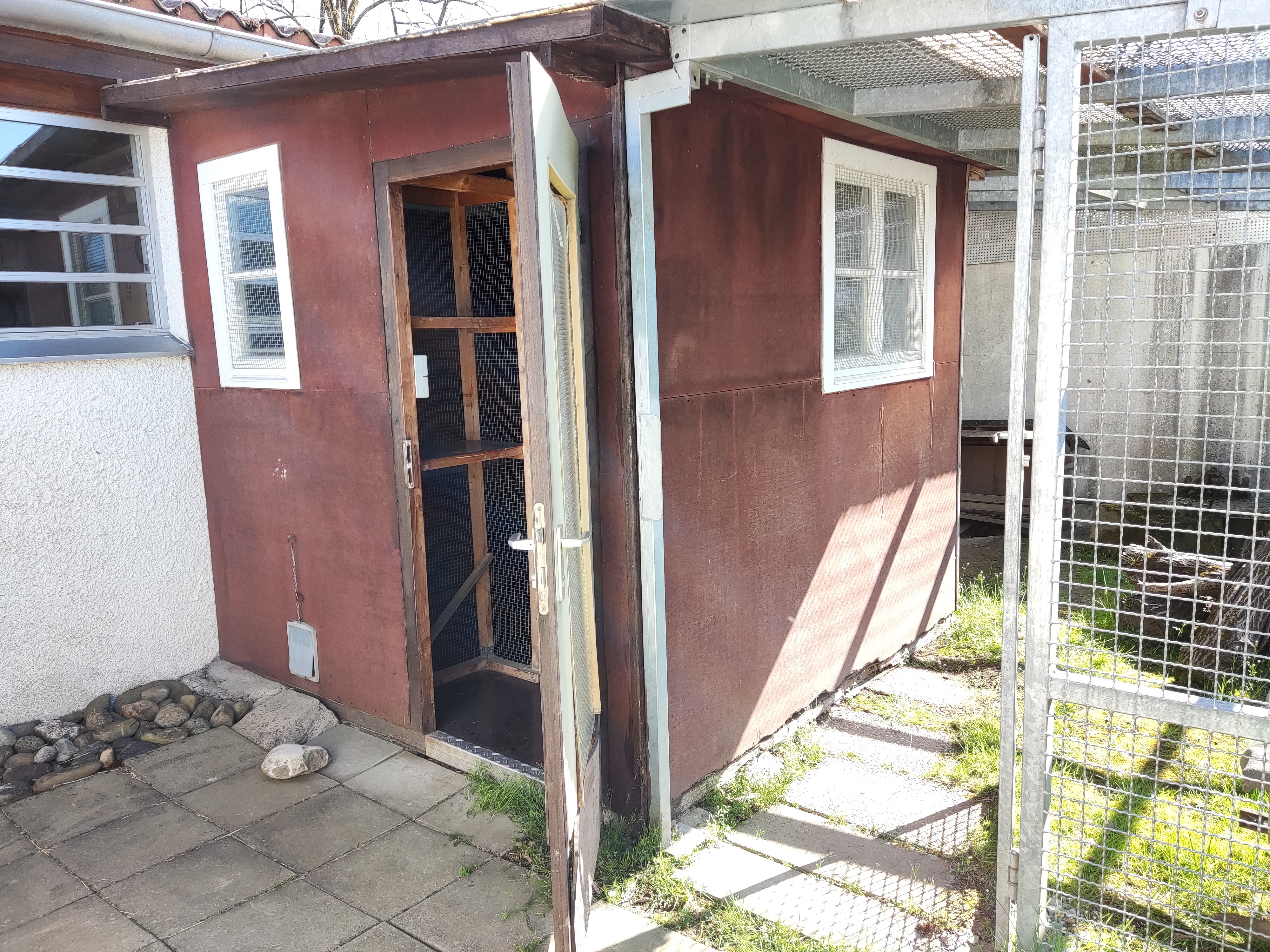 mit gesichertem Außengehege. In ihm leben je nach Bedarf Kaninchen,